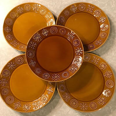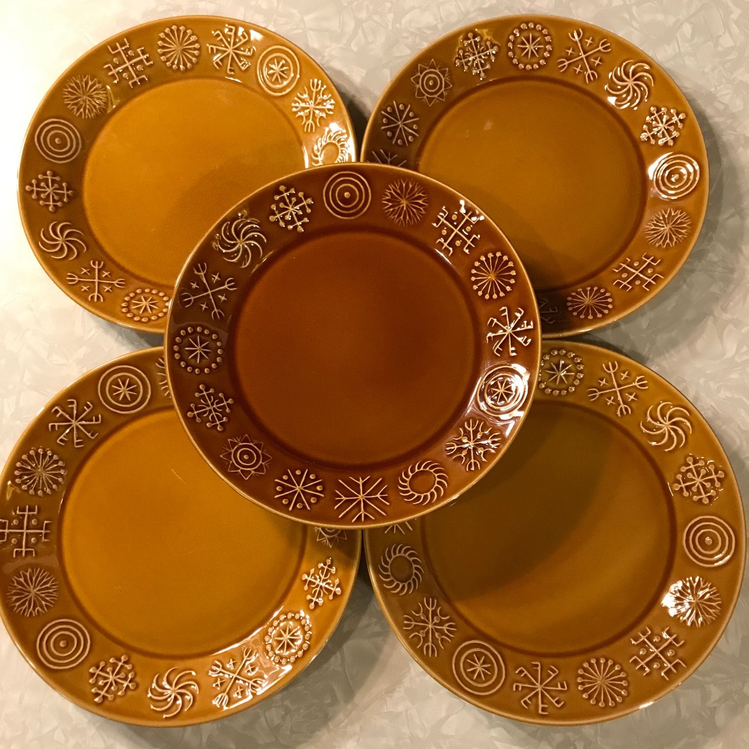 幾何学模様がエンボス状にあしらわれ、光沢の強い釉薬仕上げ。