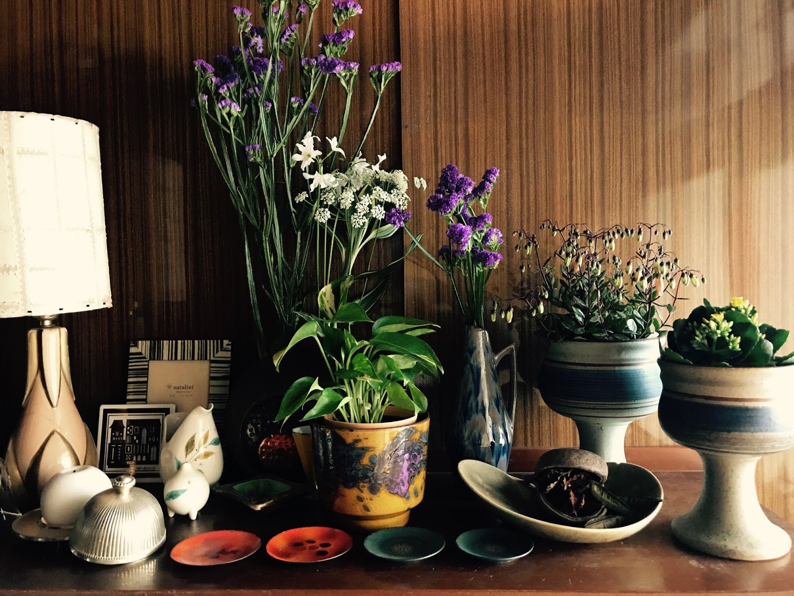 お花や観葉植物を買ってきた勢いそのままで、ディスプレイしたショーウインドウ。