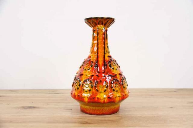 西ドイツにて製造されていたFatlavaという名がついた陶磁器、BAY Keramik社製のフラワーベースです。太陽のような、マグマのような、流れて動いているようにも感じさせる釉薬の仕上げ。パワーをもらえるようなそんな存在感がある花器です。