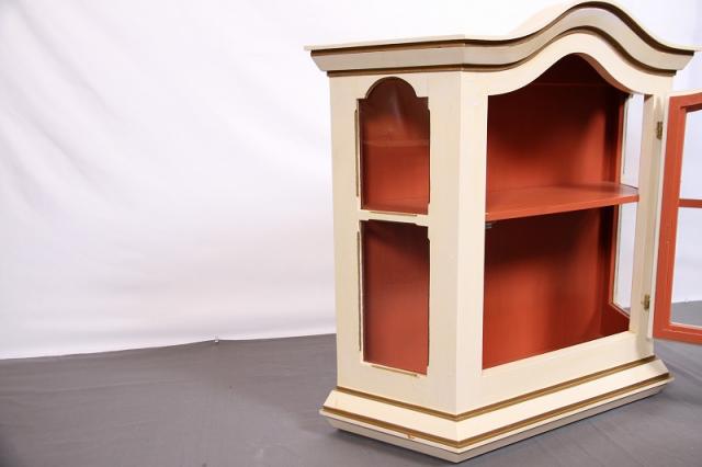 デンマークの買付で入荷したウォールキャビネットです。置型としてもお使いになれます。扉の取手が鍵のようなデザインで、ますます雰囲気があがります。アイボリーの本体と中の赤茶のカラーリングの相性抜群。