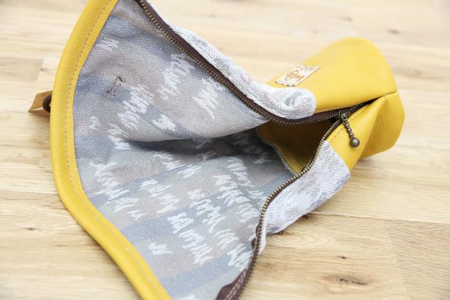 ファニチャーファブリックがレザーパイピングで縁取られたスタンド型のポーチ。