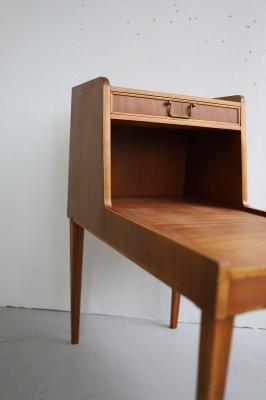 1950年代スウェーデン製のナイトスタンドです。使用されている木材はチーク、マホガニーと並んで世界三大銘木のひとつに挙げられるウォールナット(くるみ)。2段になっていますので上に植物や照明をを置いて、下の段には本を置いたりベッドサイドはもちろん、ソファー横に置いてもちょうど良く使える収納家具です。