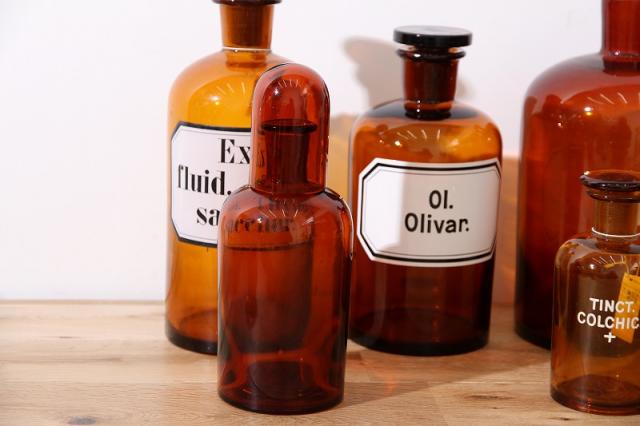 デンマークで買付た、ヴィンテージの薬瓶です。理科の実験室にありそうな趣で、小さな気泡がたくさん入った厚みのある丈夫なガラスでできています。存在感があるのでお部屋やショップのディスプレイにもオススメ。オブジェトしてはもちろん、花や植物をいける花器としても活躍してくれます。