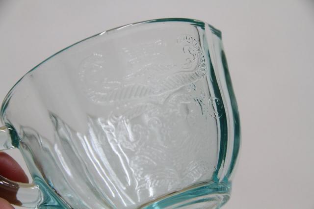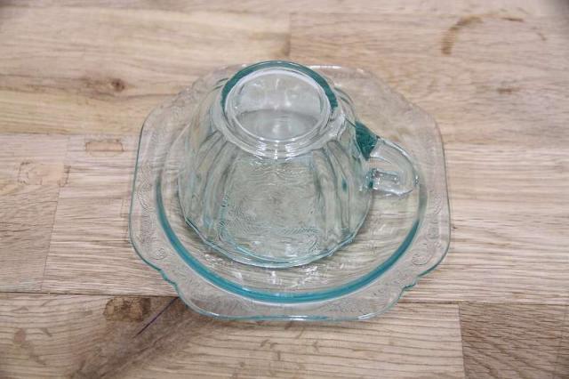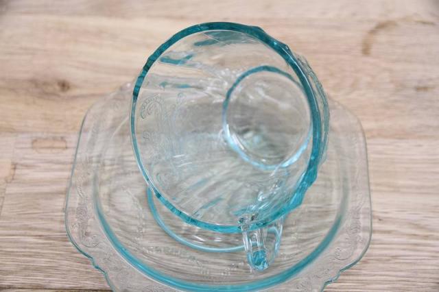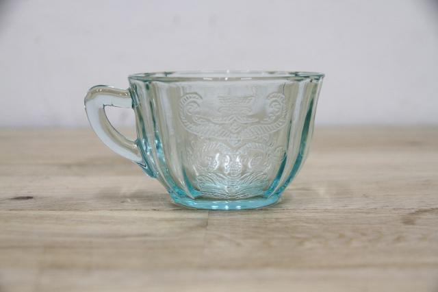 細かい刻印が施されており、高級感があるカップ&ソーサーになっております。淡い青のグラスを是非お試し下さい。