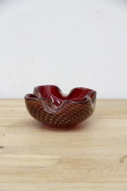 1970年代製のMuranoGlassの灰皿(ボウル)です。ずっしりとした重みと、ガラスの美しい赤の色の中には金粉の含有物。とても高貴な雰囲気を醸し出しています。ガラスの塊の中に気泡を閉じ込める技法も大変高度な技術を要するそうです。
