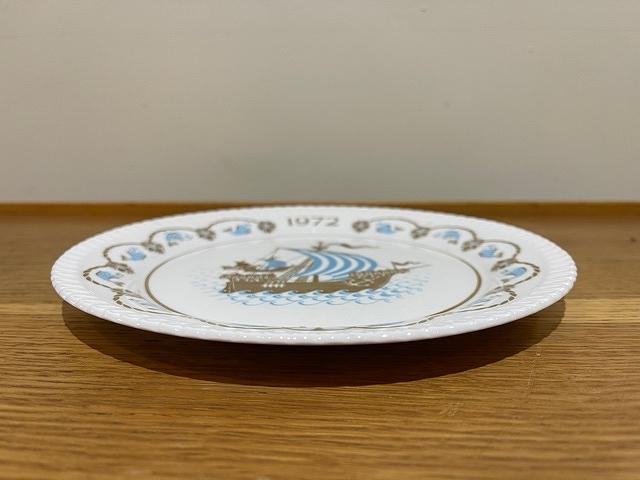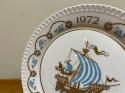 1972年は「I SAW THREE SHIPS COME SAILING IN」。帆を風で膨らませ、海を進む船が描かれています。リムの部分には、魚やヒイラギ、いかりが描かれています。