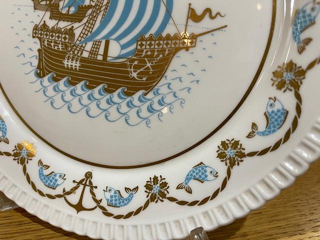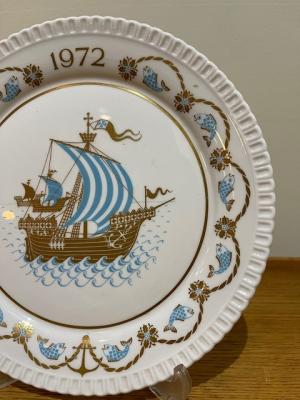 1972年は「I SAW THREE SHIPS COME SAILING IN」。帆を風で膨らませ、海を進む船が描かれています。リムの部分には、魚やヒイラギ、いかりが描かれています。