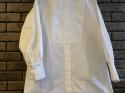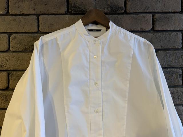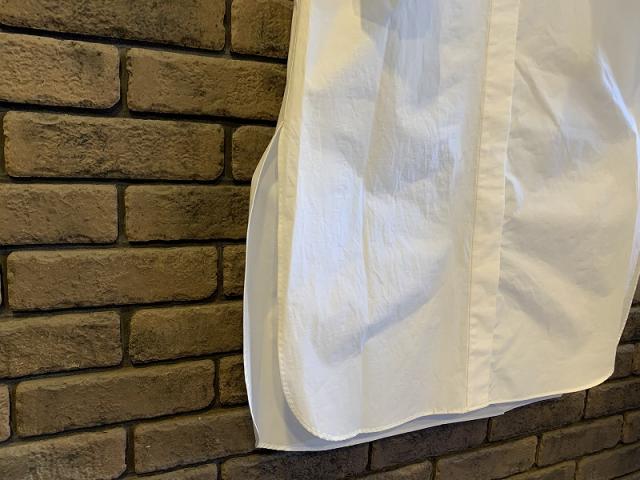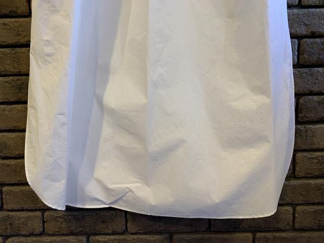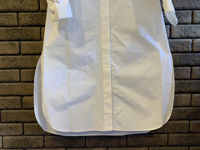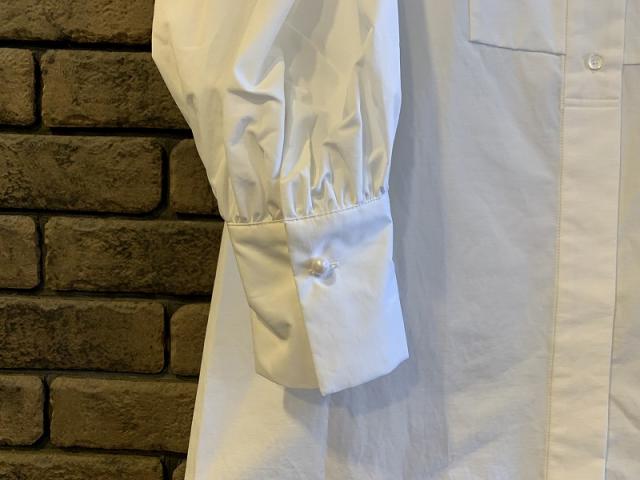 高密度のタイプライター生地を使用しており、ゆったりしたシルエットが特徴です。胸の切り替えや、パール釦の使い方などもデザインポイントです。