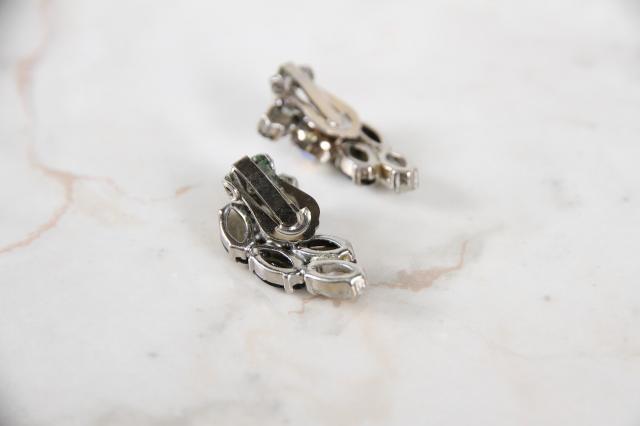 アメリカ製、オーロラのラインストーンにグレイッシュなカラーを組み合わせたシックなヴィンテージイヤリング。耳のふちに沿っていくようなフォルム。