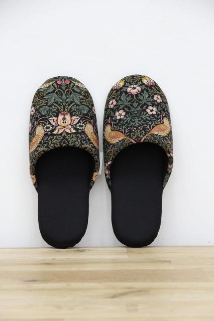 19世紀イギリスで活躍したデザイナー、ウィリアム・モリスのデザインした『いちご泥棒』プリントのファブリックを使用したソフトスリッパです。