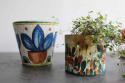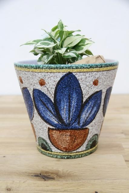 ドイツRuscha製ヴィンテージのフラワーポットです。ハンドペイントでしょうか、白地に色鮮やかなブルーの植物が描かれています。それだけでお部屋が華やぐような、存在感ある一点です。