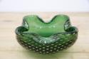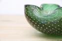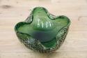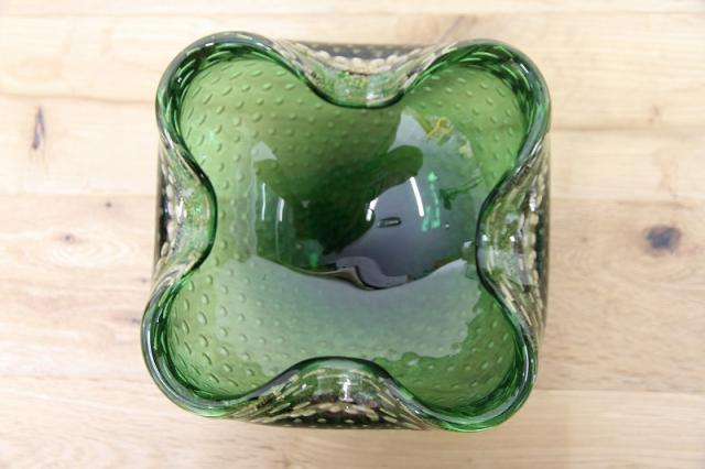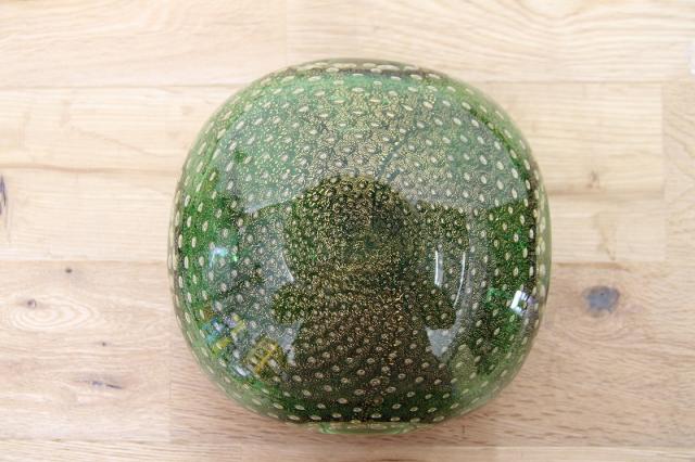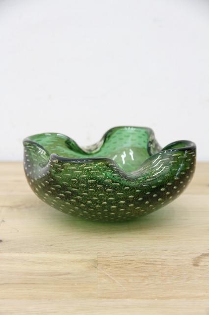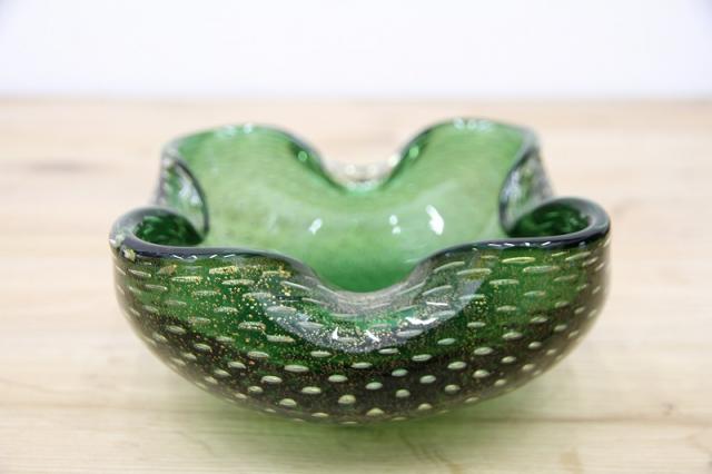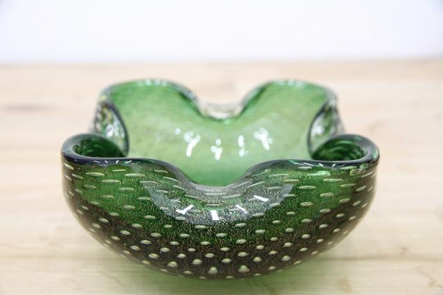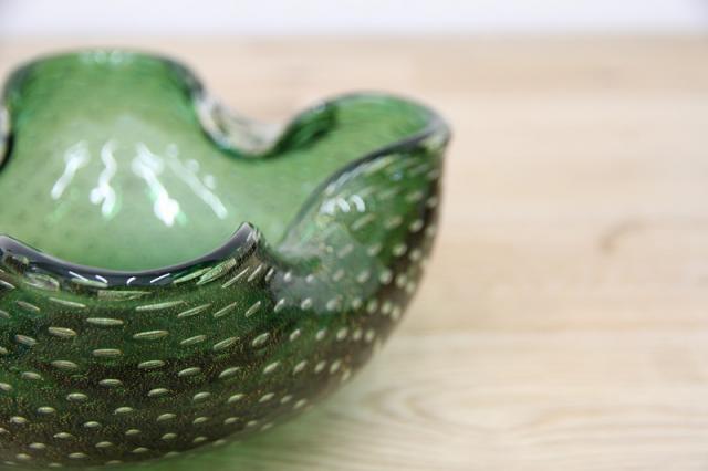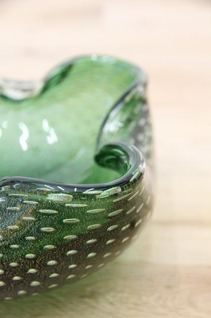1970年代製のMuranoGlassの灰皿(ボウル)です。ずっしりとした重みと、ガラスの美しい緑の色の中には金粉の含有物。とても高貴な雰囲気を醸し出しています。ガラスの塊の中に気泡を閉じ込める技法も大変高度な技術を要するそうです。