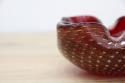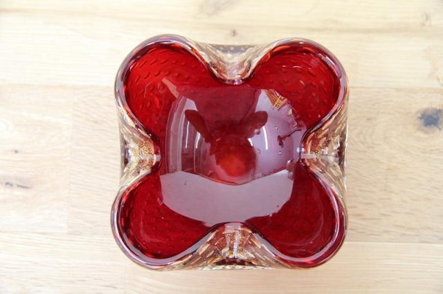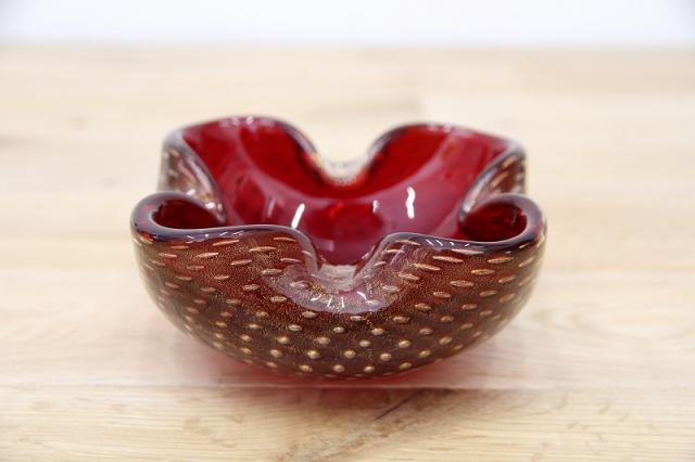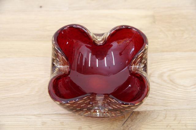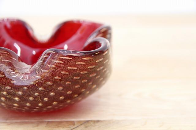 1970年代製のMuranoGlassの灰皿(ボウル)です。ずっしりとした重みと、ガラスの美しい赤の色の中には金粉の含有物。とても高貴な雰囲気を醸し出しています。ガラスの塊の中に気泡を閉じ込める技法も大変高度な技術を要するそうです。