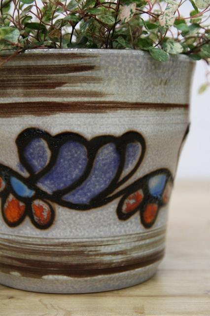 ドイツ製ヴィンテージのレトロなフラワーポット。陶器製です。ブルーとオレンジの釉薬の色が映えますね。お好きなインドアグリーンと合わせてインテリアとしてお楽しみください!
