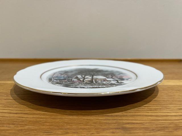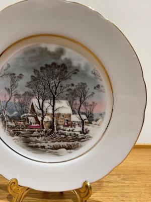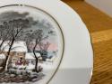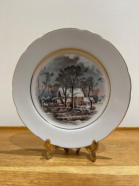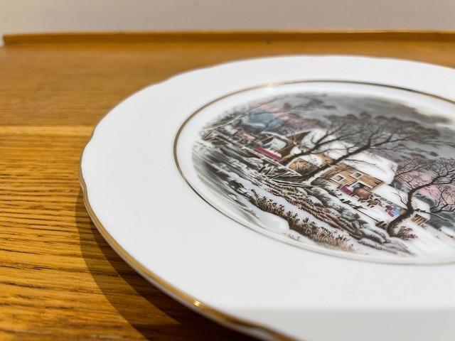 リムにはゴールドの縁取りがあり、雪景色に覆われた小川のほとりに経つ農家の様子が描かれています。牛や馬の表情もとても繊細です。