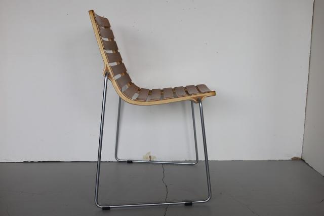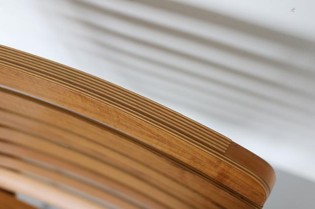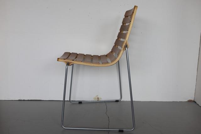 北欧デンマーク買付便のプライウッドチェア。薄くスライスされた木の層の美しさと、緩やかな曲線が目にとまります。脚はスチール製で全体的に軽やかな印象のチェアです。
