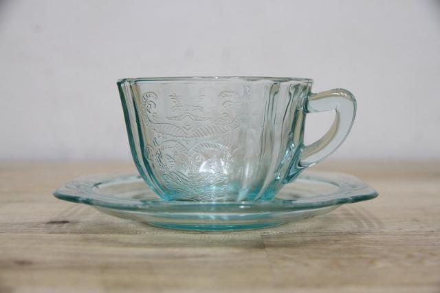 細かい刻印が施されており、高級感があるカップ&ソーサーになっております。淡い青のグラスを是非お試し下さい。