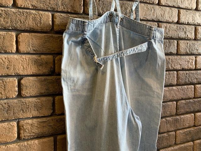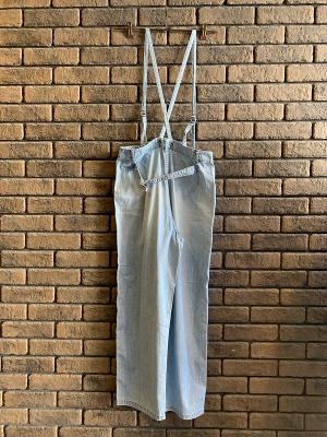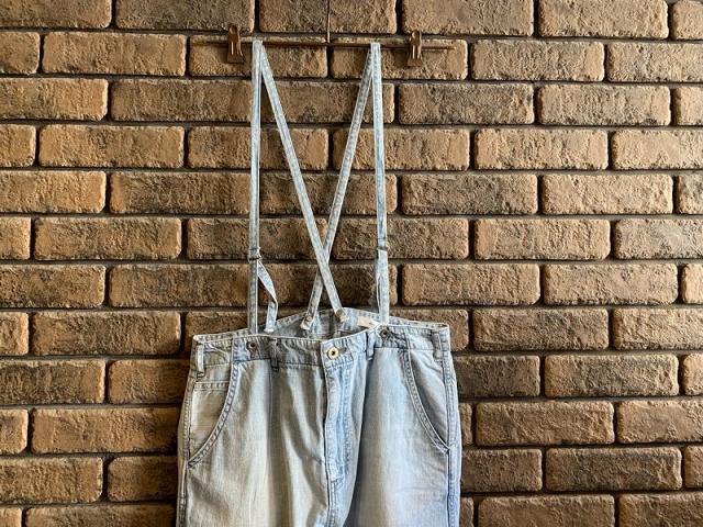 7.25オンスのライトデニムを使用したサスペンダーパンツ。ナチュラルなムラ糸で織られた生地は、加工した時に古着を再現したような加工感に仕上げています。シャンブレーよりもソフトで膨らみがあり、経糸の番手が太いのである程度の耐久性もあります。