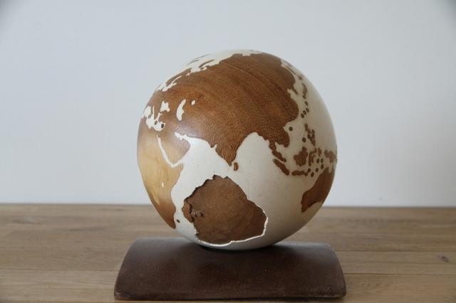 ウッドの台座に、天然木と樹脂を使用した地球儀をセットできます。