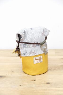 上部のヴィンテージの鍵チャーム付きのゴムの留め方次第で様々な形状のアイテムのケース、カバーにアレンジ可能です。