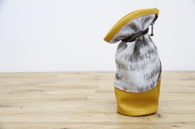 ファニチャーファブリックがレザーパイピングで縁取られたスタンド型のポーチ。