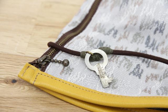 上部のヴィンテージの鍵チャーム付きのゴムの留め方次第で様々な形状のアイテムのケース、カバーにアレンジ可能です。