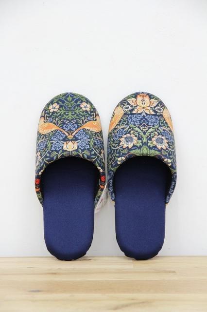 19世紀イギリスで活躍したデザイナー、ウィリアム・モリスのデザインした『いちご泥棒』プリントのファブリックを使用したソフトスリッパです。