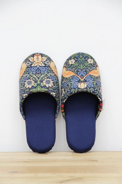 19世紀イギリスで活躍したデザイナー、ウィリアム・モリスのデザインした『いちご泥棒』プリントのファブリックを使用したソフトスリッパです。