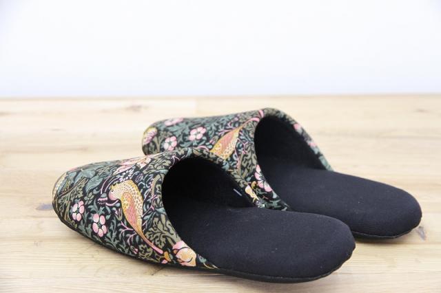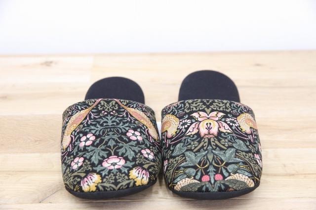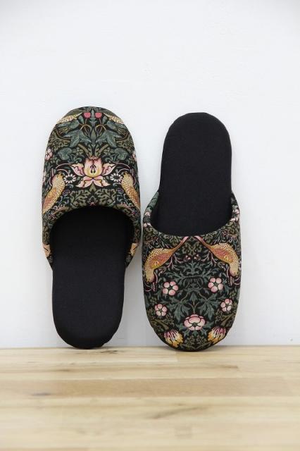 19世紀イギリスで活躍したデザイナー、ウィリアム・モリスのデザインした『いちご泥棒』プリントのファブリックを使用したソフトスリッパです。