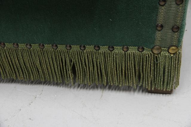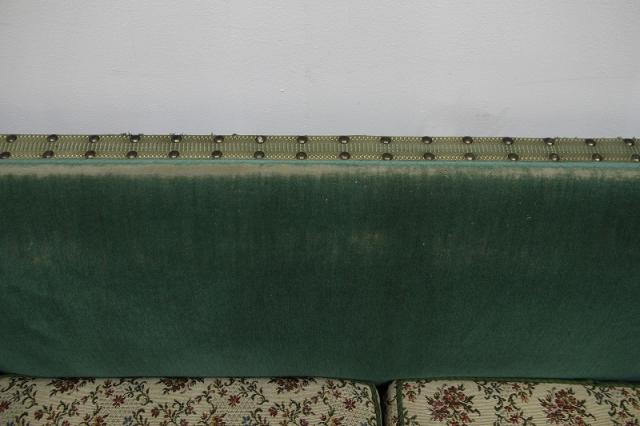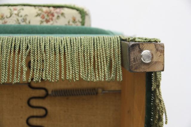 モケット素材と、座面クッションの花柄の織り生地、そして鋲などの装飾も雰囲気抜群です。