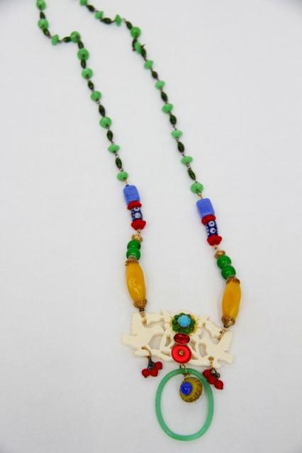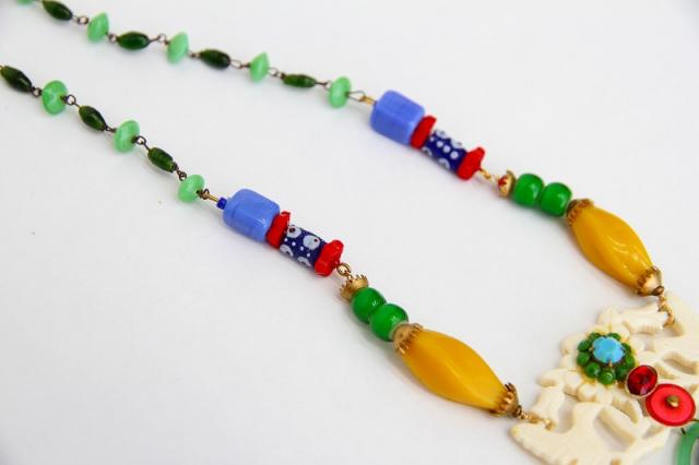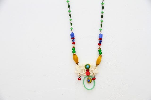 ヴィンテージパーツを自由な発想で組合わせた、存在感のあるJoli Jewelryのネックレスです。50年代のヴィンテージパーツを使い、全体的にカラフルなデザインは、どこかボヘミアンな雰囲気が漂います。