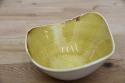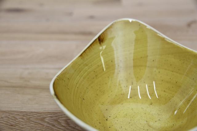 非対称形のゆるやかな三角形のロータスボウル。料理を盛り付けるとバランスよく見えます。
