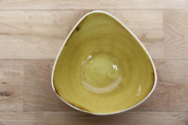 非対称形のゆるやかな三角形のロータスボウル。料理を盛り付けるとバランスよく見えます。