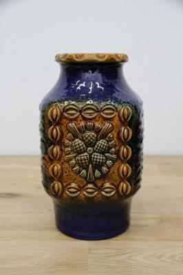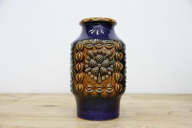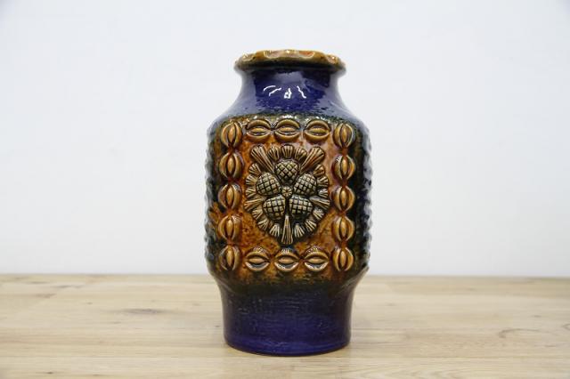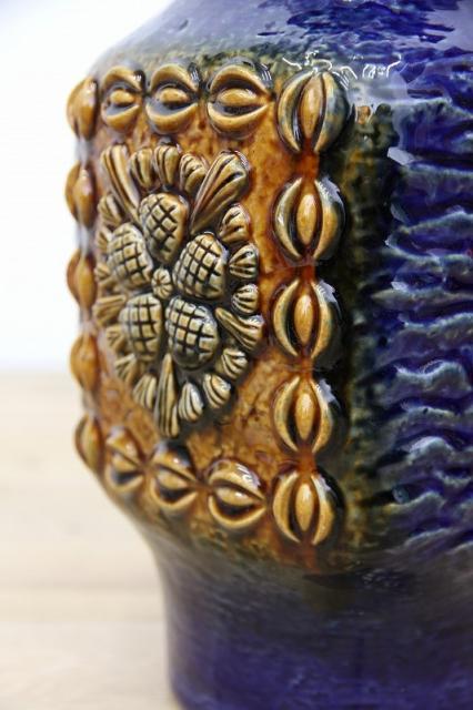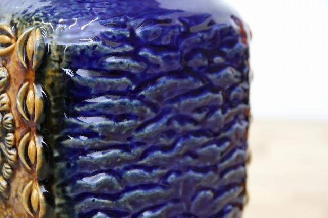 ドイツDumler&Breiden社製のヴィンテージフラワーベース、陶器製です。花と実でしょうか、凹凸感あるデザインと、堂々たる青の色の威力を感じる存在感あるアイテムですね。お花と合わせる楽しさと、この花瓶自体をオブジェとしてお部屋のインテリアとして楽しんでいただけたらと思います。