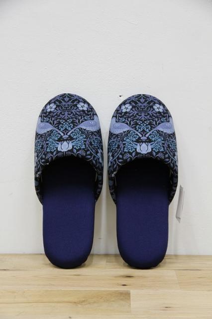 19世紀イギリスで活躍したデザイナー、ウィリアム・モリスのデザインした『いちご泥棒』プリントのファブリックを使用したソフトスリッパです。