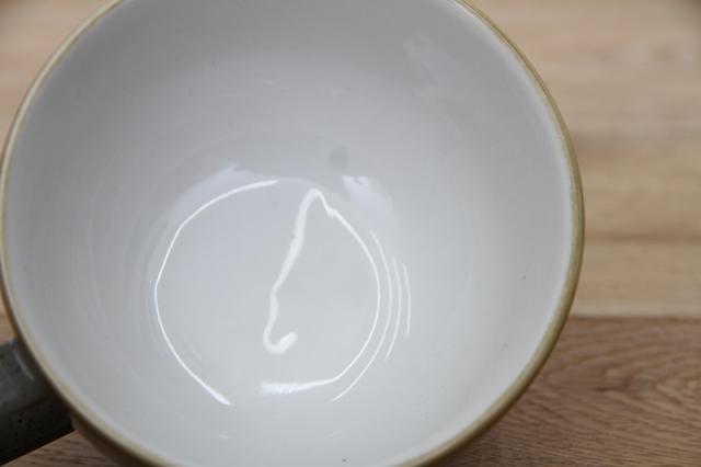 ストーンキャストの他のテーブルウェアと違って刷毛目がなく、ぽってりとした質感もよく、飲み口のエッジには柔らかい茶色~黄色のラインが引かれているのも素敵なポイントです。
