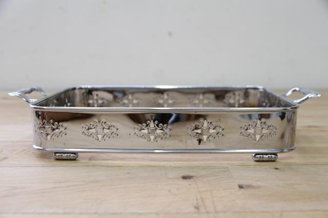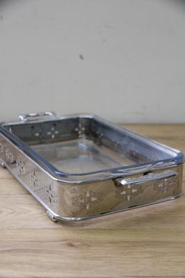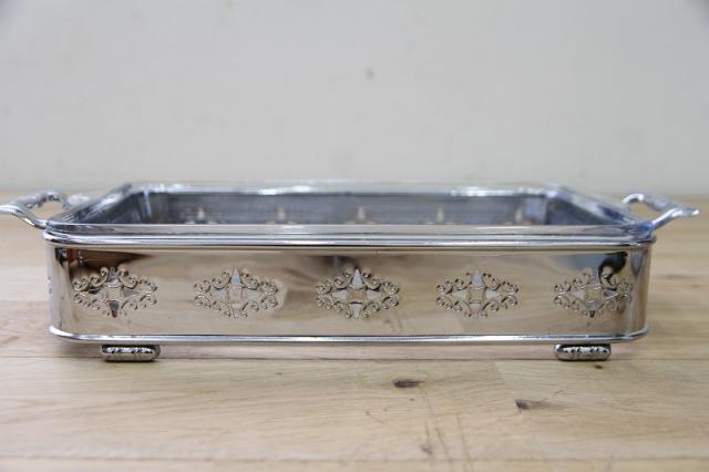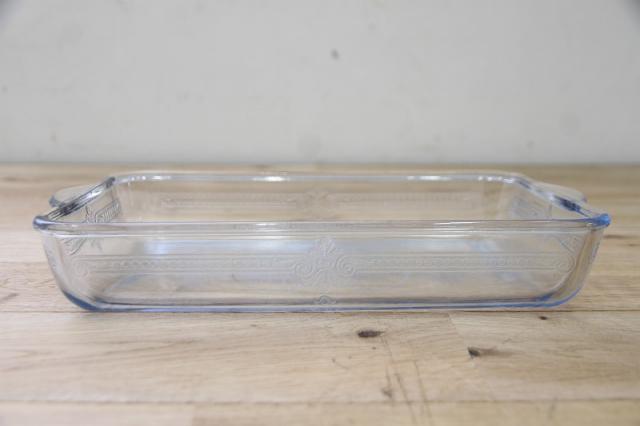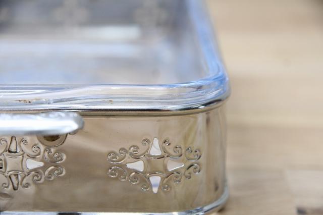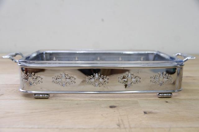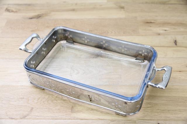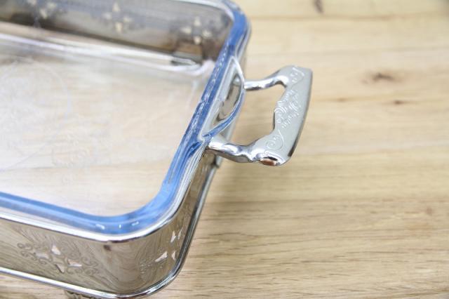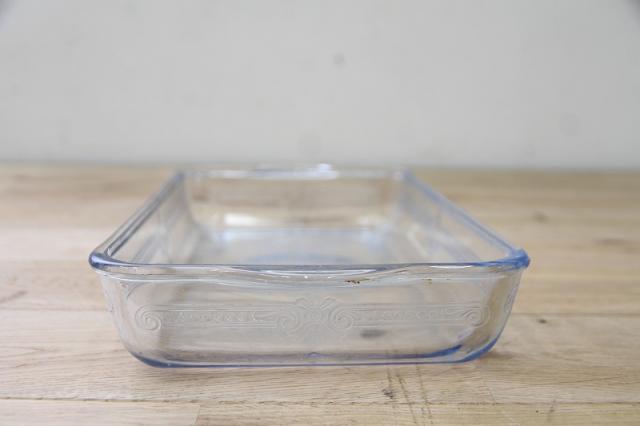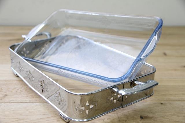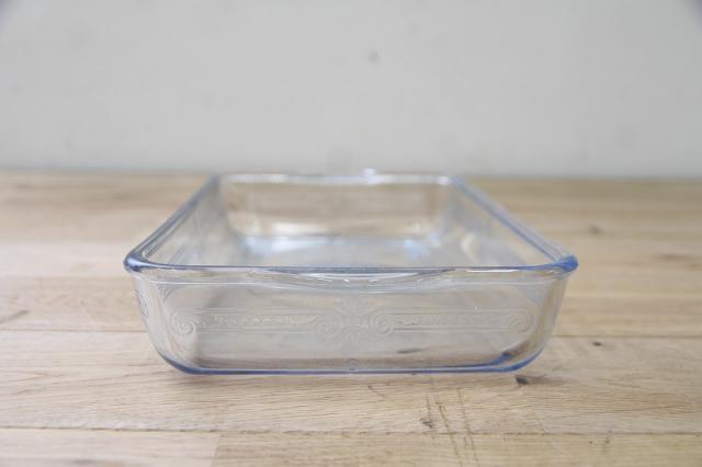 ファイヤーキングのサファイヤブルーのユーティリティディッシュです。珍しいホルダー付きです。当時のファイヤーキングのカタログにも「ケーキ、パン、ビスケット、ジンジャーブレッドや焼きりんご、お肉料理などに」と書いてあります。