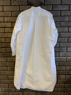 高密度のタイプライター生地を使用しており、ゆったりしたシルエットが特徴です。胸の切り替えや、パール釦の使い方などもデザインポイントです。