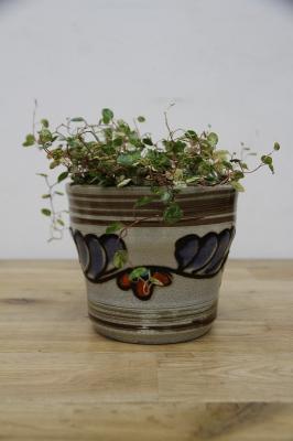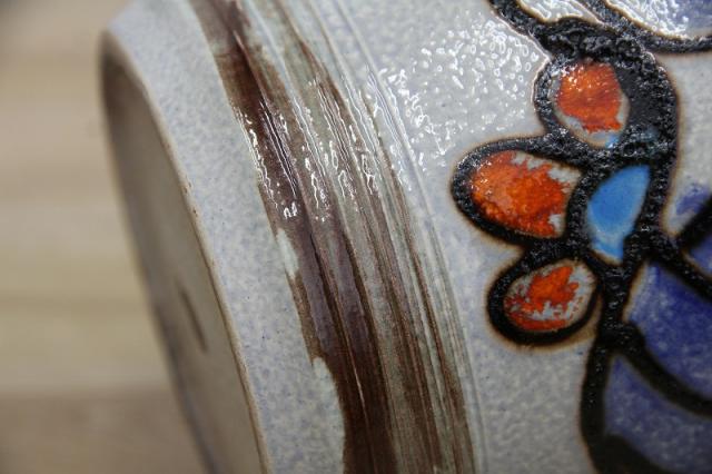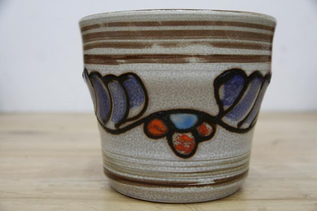 ドイツ製ヴィンテージのレトロなフラワーポット。陶器製です。ブルーとオレンジの釉薬の色が映えますね。お好きなインドアグリーンと合わせてインテリアとしてお楽しみください!