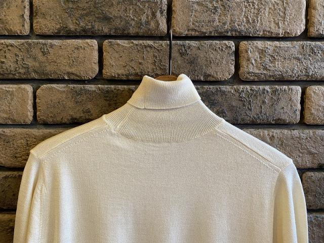 シルクは最高品質の家蚕ペニーA‐1を使用。品のある光沢と家蚕特有のしなやかでソフトな風合いを持つ家蚕シルクに、これまた最高品質のアラシャンカシミヤを混紡した高級素材です。アラシャンカシミヤとは、中国内蒙古自治区西部のある特定の地域において産出される、中国で一番細く、風合いの良いカシミヤです。その素材で長い期間重宝する16ゲージのタートルネックP/Oを作りました。
