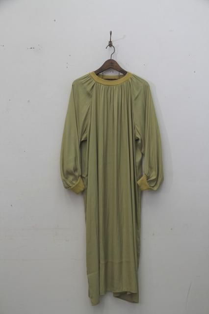 滑らかなサテン生地を使用したシンプルなギャザーワンピース。 首周りと袖周りにたっぷりと入ったギャザーと上品な光沢感が魅力のアイテムです。
