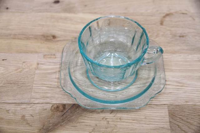 細かい刻印が施されており、高級感があるカップ&ソーサーになっております。淡い青のグラスを是非お試し下さい。