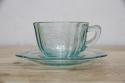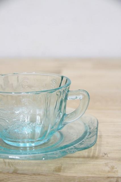 細かい刻印が施されており、高級感があるカップ&ソーサーになっております。淡い青のグラスを是非お試し下さい。