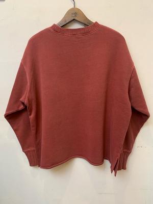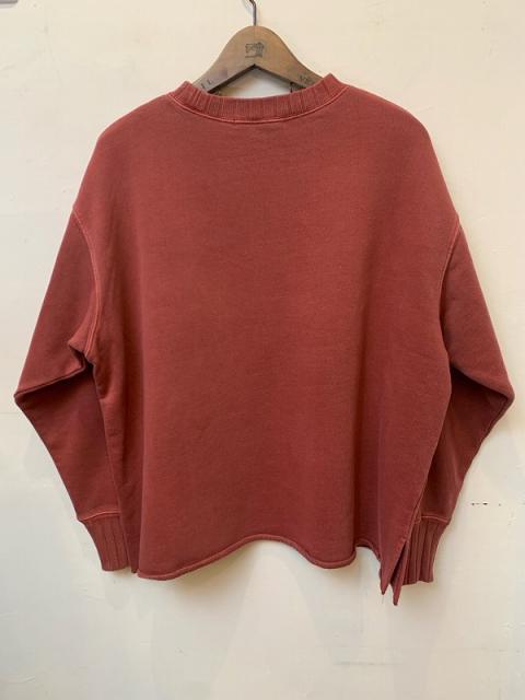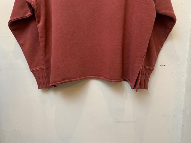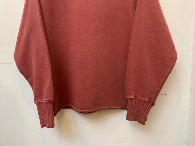 トンプキン裏毛とは、糸に負荷をかけずにゆっくり時間をかけて編まれたもので、やわらかくふっくらとした手触りが特徴です。今回はさらに目を詰めてボリューム感を出しています。リブは針抜きに編み立てて、縫製後ピグメント加工をすることで古着のような味のある仕上がりに。