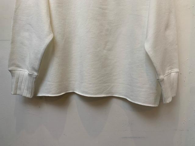 トンプキン裏毛とは、糸に負荷をかけずにゆっくり時間をかけて編まれたもので、やわらかくふっくらとした手触りが特徴です。今回はさらに目を詰めてボリューム感を出しています。リブは針抜きに編み立てて、縫製後ピグメント加工をすることで古着のような味のある仕上がりに。
