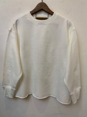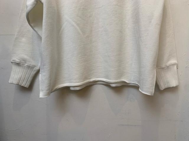 トンプキン裏毛とは、糸に負荷をかけずにゆっくり時間をかけて編まれたもので、やわらかくふっくらとした手触りが特徴です。今回はさらに目を詰めてボリューム感を出しています。リブは針抜きに編み立てて、縫製後ピグメント加工をすることで古着のような味のある仕上がりに。