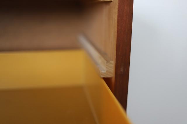 ドイツ・ベンネッケンシュタインのHARZ MOBELという家具メーカーから、ベッドサイド用の家具として当時販売されていたもののようです。外側はバーチ材やメープル材が使用されています。引き出しの取手と箱部分はプラスチック製でとってもレトロな仕上がりの3段チェスト。