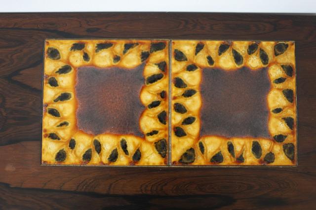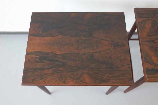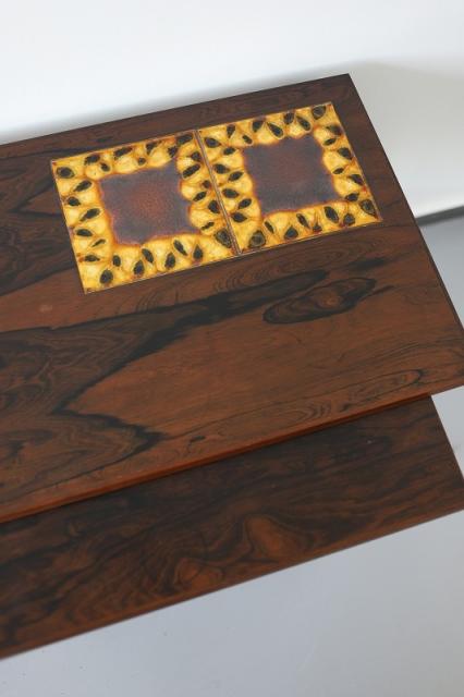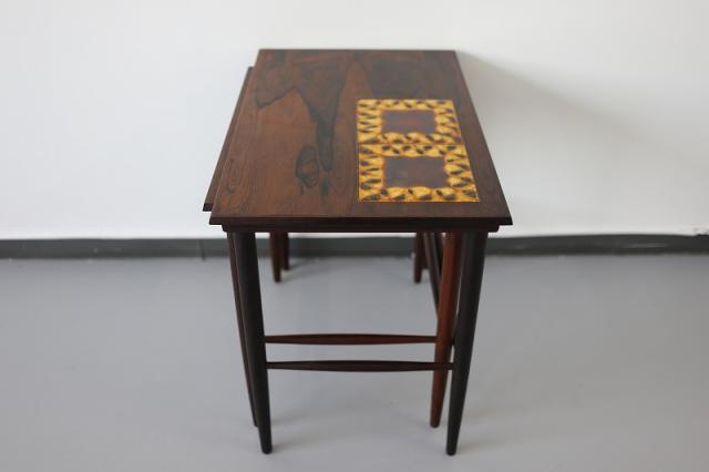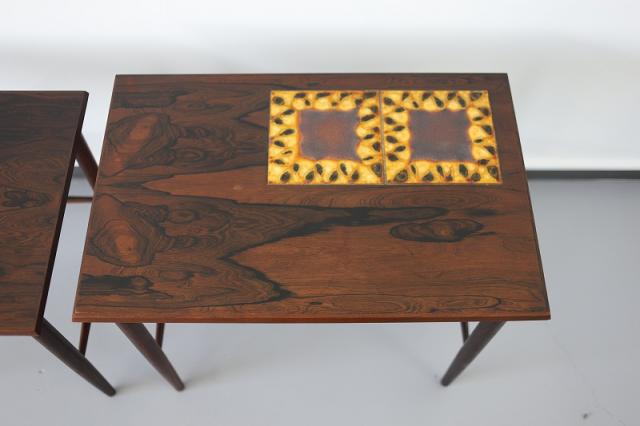 北欧デンマーク製のネストテーブルです。ネストとは「入れ子」の意味があることばで、大きなサイズのテーブルに小さなサイズのテーブルがきれいに収まるつくりの家具です。ワンポイントのタイルがデザインのポイント。力強いローズウッドの木目も雰囲気が出ます。