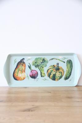 古い植物図鑑のように、繊細なタッチで様々な野菜が描かれていて、美しいページをそのまま切り取り食卓に飾ったような柄のトレイです。
